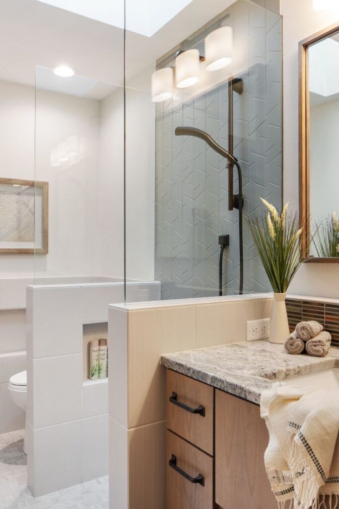 In bathroom remodels where the shower needs to be separated from the rest of the room, a low tiled half-wall (also called a nib wall or knee wall) topped with a small frameless glass panel is often a more beautiful and more practical alternative to a full-height glass enclosure. The half-wall can be tiled to match the rest of the bathroom for a seamless, architectural quality, while the small glass panel above keeps water contained without the visual heaviness of full glass screens.