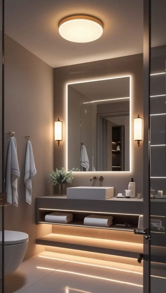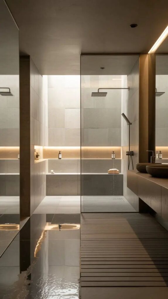 Great bathroom lighting has at least three layers: task lighting at the vanity (backlit mirror or wall sconces beside the mirror), ambient overhead lighting on a dimmer, and accent lighting (LED strips under the floating vanity, or inside niches). Every light should be on a separate circuit with its own dimmer where possible. This gives you complete control over the mood of the room — from bright and functional in the morning to deeply atmospheric in the evening. Plan it before you tile. You will never regret it.