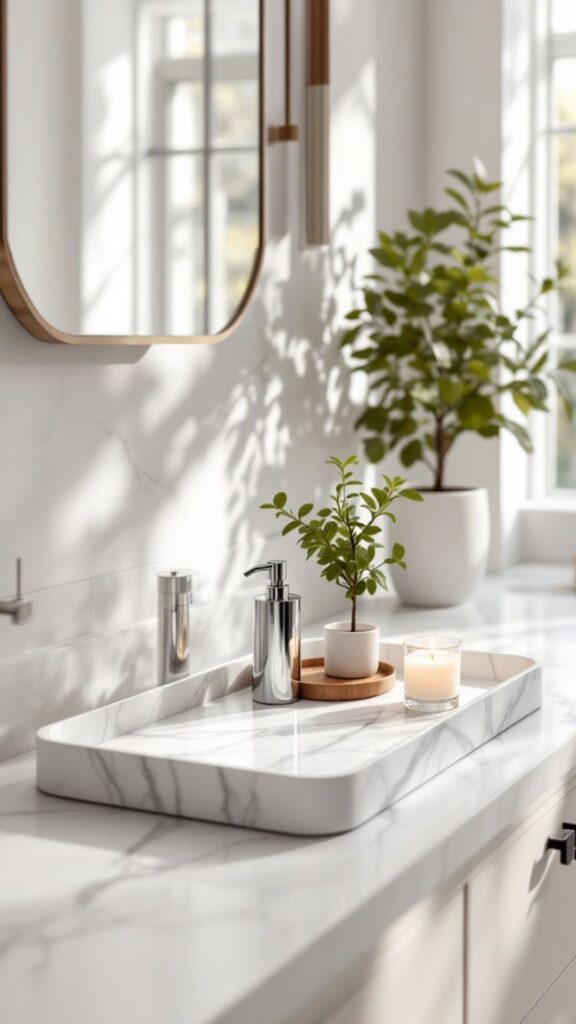 A wooden tray or wooden soap dish introduces organic warmth without disrupting the palette. A small potted plant brings living green that feels right against black and white. Natural linen hand towels in undyed cotton add texture and warmth. Warm-toned marble (Calacatta or Statuario with gold veining) as a countertop material reads as white but brings organic complexity. Even one brass accent among otherwise black hardware warms the whole room. These touches are what separate a cold monochrome bathroom from a warm, sophisticated one.