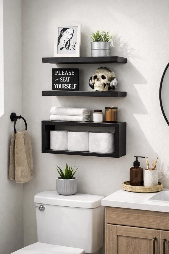 Open shelving in a black and white bathroom is an opportunity to extend the palette into every accessory — creating a cohesive, editorial quality that feels designed rather than assembled. Matte black floating shelves on white walls, styled exclusively in black and white objects, create a display that reads as a curated composition rather than a collection of random bathroom products.