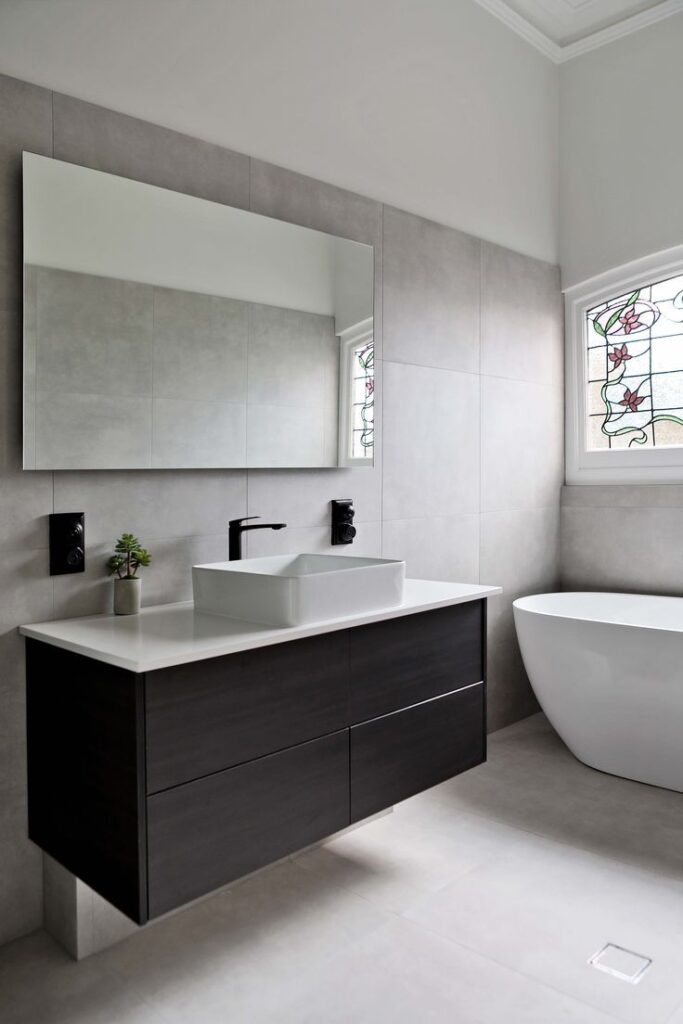 A floating matte black vanity is the most architecturally beautiful choice: the visible floor beneath keeps the room feeling open despite the dark colour of the unit. Pair with a white undermount basin for maximum contrast, a large mirror (in matte black or frameless glass), and white or light-coloured tiles on walls and floor. Add warm-toned accessories — a small plant, a natural linen hand towel, a wooden tray — to prevent the combination from feeling too stark.