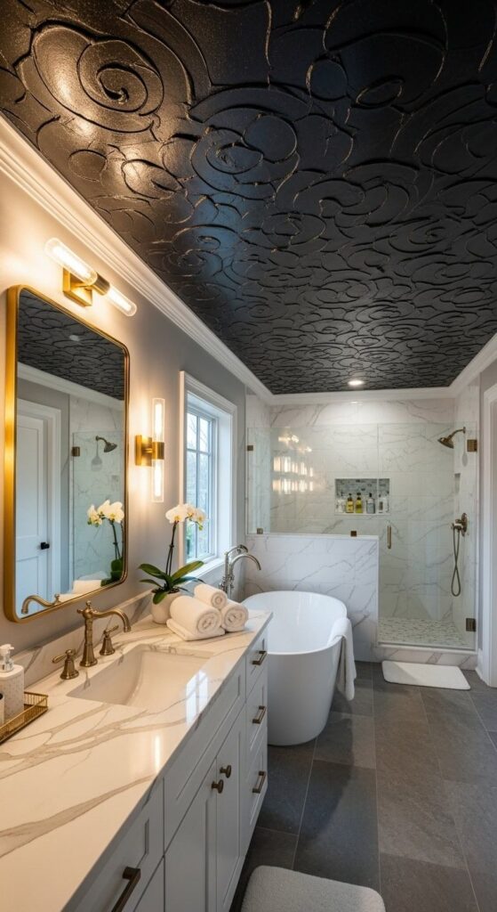 A black ceiling in a bathroom is one of those counterintuitive design choices that sounds wrong on paper and looks absolutely right in practice. Far from making the room feel smaller, a matte black ceiling creates a cocooning, cave-like quality that is surprisingly intimate and luxurious — like being held rather than exposed. Against white walls and white fixtures, it creates a bold graphic contrast that photographs spectacularly.