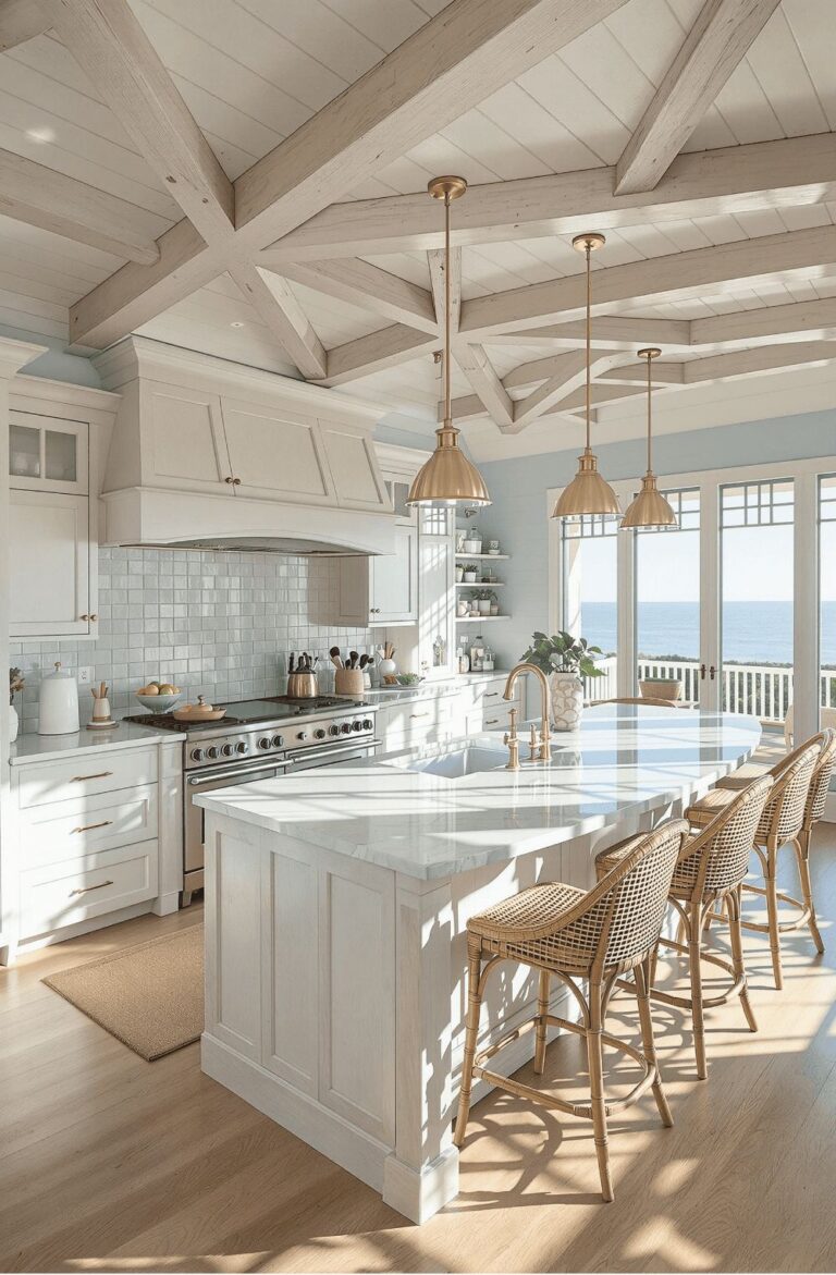 If your kitchen layout allows it, maximize the connection between indoors and outdoors: replace a solid wall with wide glass doors or folding panels that open the kitchen directly to a garden, terrace, or balcony. Continue the same terracotta or tile floor indoors and out to blur the boundary between spaces. Even if a full architectural opening isn’t possible, a large kitchen window above the sink overlooking greenery, kept unobstructed and filled with natural light, captures the spirit of Caribbean indoor-outdoor living beautifully. The goal is a kitchen that feels like it breathes with the outside world.