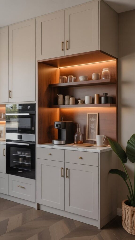 A breakfast station zone can be created with relatively simple cabinetry decisions: open shelves above the counter for mugs and jars, a socket at counter level for the kettle, a built-in coffee machine in the upper cabinet or under-counter appliance space, and a small drawer for cutlery. Styling this zone as a clearly defined, beautifully organised section — different styling from the main prep area, perhaps with more open display — creates a kitchen that feels purposefully zoned and significantly more functional.