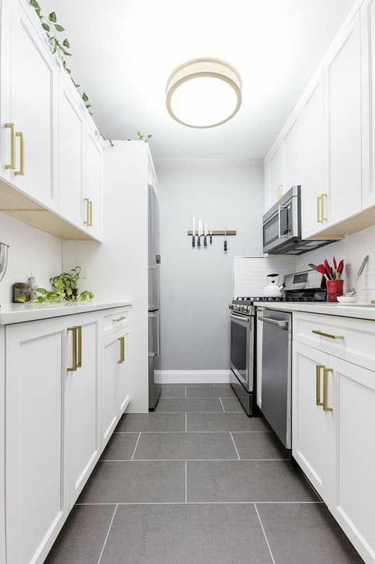 The direction in which floor tiles are laid in a galley kitchen has a meaningful effect on how the space feels — and it’s a design decision that costs nothing extra to make correctly. Tiles laid lengthways (with the long axis running in the same direction as the corridor) create a strong visual line that leads the eye toward the far end of the kitchen, making the space feel longer and the corridor feel more like a visual journey than a narrow box.
