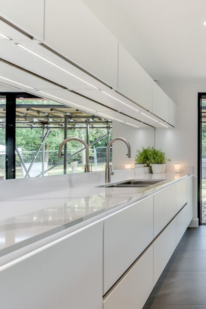 A mirrored or high-gloss splashback on one side of a galley kitchen is one of the most dramatic and most effective spatial illusion techniques available to any narrow kitchen — and in a galley, where width is the persistent challenge, this technique is particularly valuable. A mirror-quality splashback reflects the opposite wall, effectively doubling the perceived width of the kitchen and creating a visual depth that appears to extend the space beyond its actual dimensions.