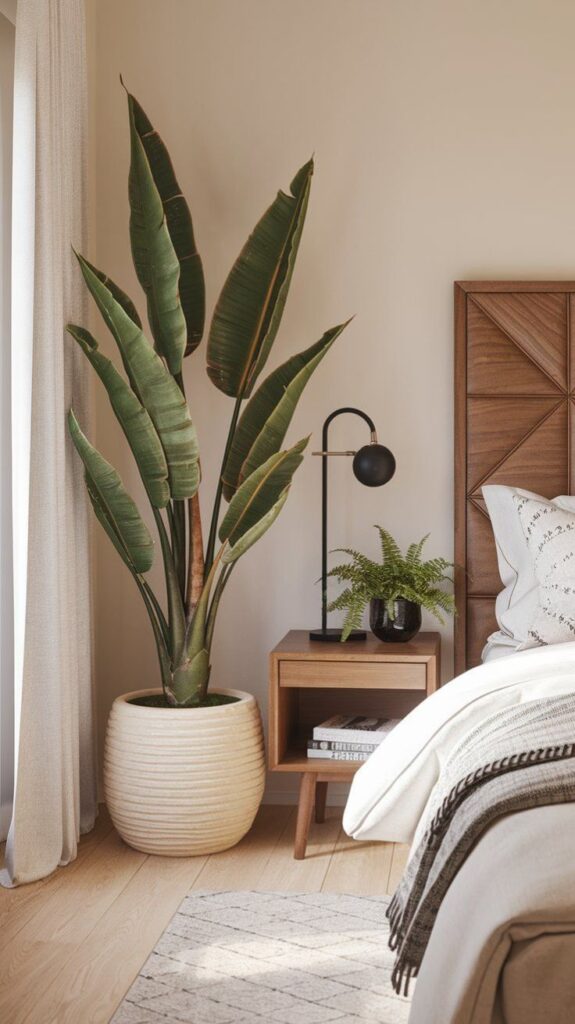 Choose bedroom-appropriate plants: snake plants (one of the few plants that releases oxygen at night, and virtually indestructible in low light), trailing pothos (beautifully lush on a high shelf or hanging from a hook), peace lilies (tolerant of lower light and elegantly beautiful), or a simple succulent on the windowsill. A large floor plant in a beautiful ceramic or terracotta pot — a snake plant, a fiddle-leaf fig, or a large monstera — in the corner of the room adds height and architectural presence. One thriving, healthy plant is worth ten artificial ones. Choose it well, care for it properly, and it will reward the bedroom with life.