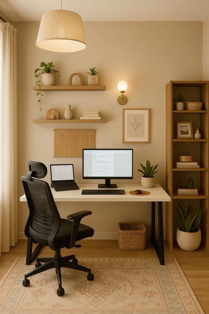 You don’t need a whole room to create a beautiful workspace — a well-designed corner can be just as inspiring and functional. A wall-mounted corner desk maximizes every inch of floor space while giving you a surprisingly generous work surface. Frame the corner with floating shelves above, a beautiful floor lamp beside, and sheer curtains on any nearby window to soften the light. Add a plush chair and a small rug beneath, and your corner nook will feel like a dedicated, intentional space rather than an afterthought. The coziness of a corner can actually make a small office feel more focused and productive.